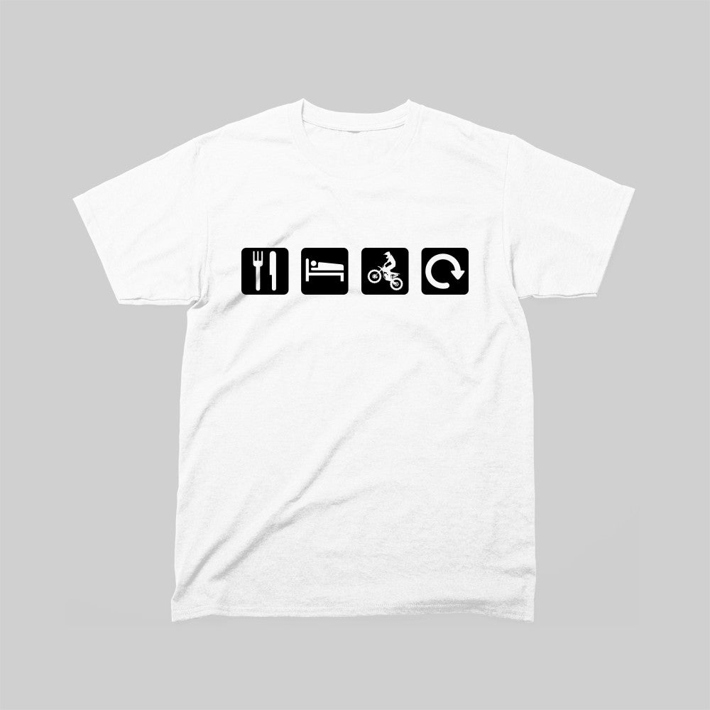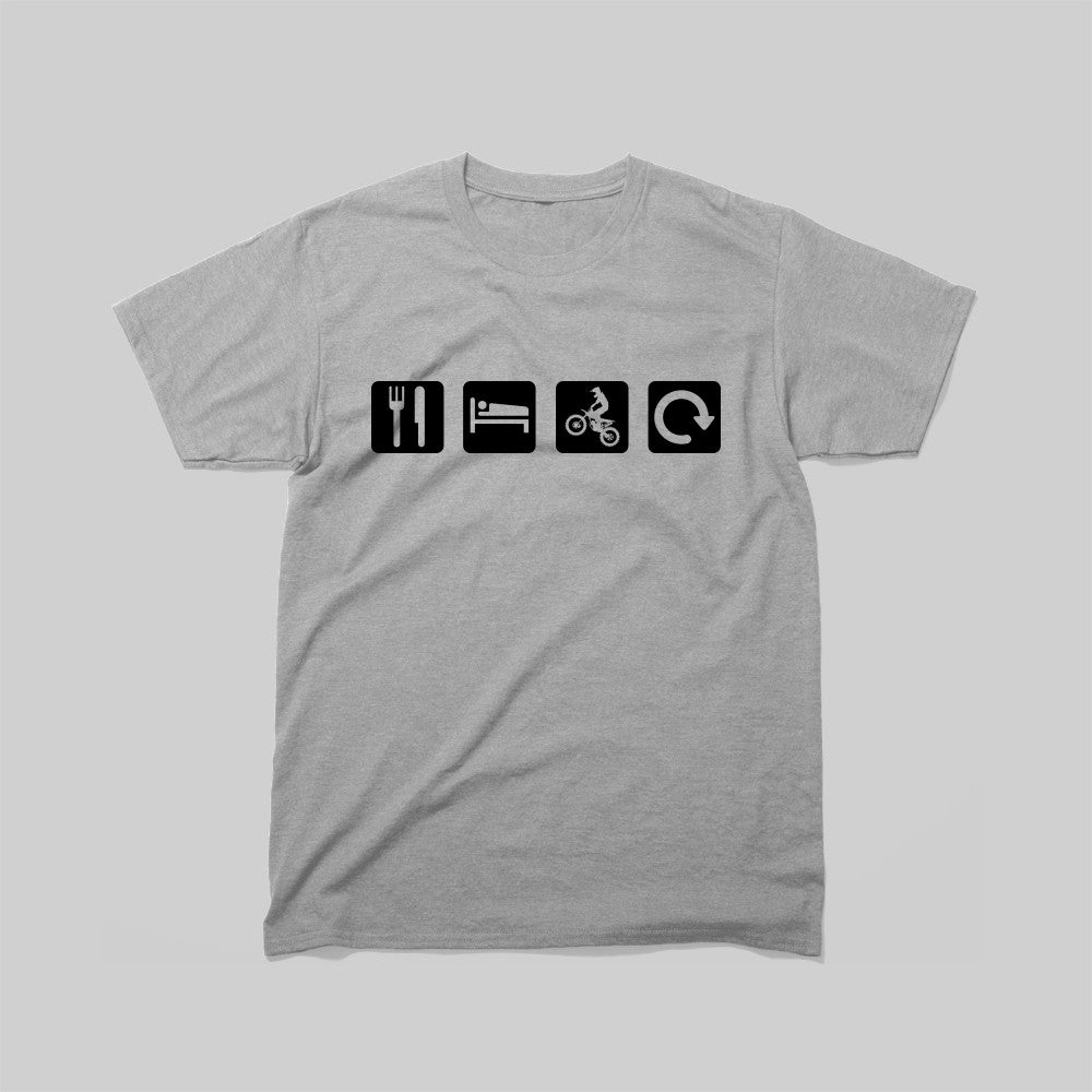 Voeg dadelik styl by jou klerekas met die Eet, Slaap, Veldryfiets, Herhaal t-hemp van DEFOK Handelsmerk. Die duursame katoenstof van 180 g sal sekerlik jare hou. Druk u individualiteit uit met hierdie stylvolle en blywende t-hemp.